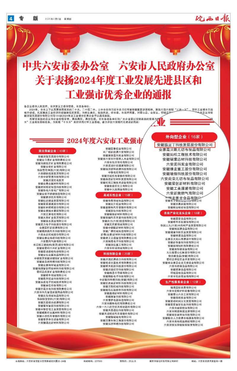 此次榮獲兩項殊榮,是對酷豆丁過去一年成績的充分肯定,更是對公司未來發(fā)展的激勵和鞭策??岫苟⒁源藶槠鯔C,繼續(xù)堅持創(chuàng)新驅動、綠色發(fā)展,做實智能綠色制造,在實現(xiàn)公司高質(zhì)量發(fā)展的同時,積極履行社會責任,為六安工業(yè)強市和工業(yè)發(fā)展貢獻更多力量,譜寫更加輝煌的新篇章!