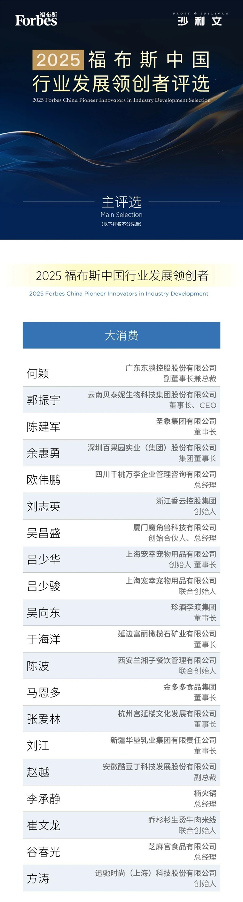 2025年3月22日,由福布斯中國與弗若斯特沙利文(Frost & Sullivan,簡稱“沙利文”)聯(lián)合主辦的“中國企業(yè)家年會(huì)暨福布斯中國行業(yè)發(fā)展領(lǐng)創(chuàng)者評(píng)選”在上海盛大舉行。