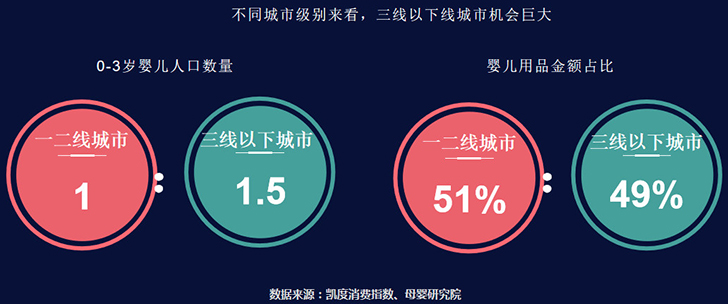 同樣純線上購買的消費者非常少,絕大部分是全渠道購買,同時線上線下購買的人均消費是僅在線下購買的1.2倍。另外,一二線城市和三線以下的城市對比,0~3歲的嬰兒人口的數(shù)量是1:1.5,可以看三線以下的城市是巨大的金礦,而且嬰兒用品的消費金額比幾乎是1:1,這是一個巨大的藍海。