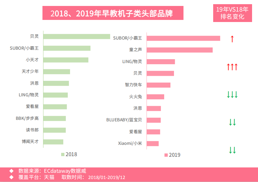從2018、2019年的榜單對比來看,仍然停留在榜單的就是小霸王、物靈、貝靈(下滑到第4名),其他品牌基本上全部被換掉。同時也新增了一些品牌比如火火兔,還有小米,它也滲透了這個品類里來,并且已經(jīng)進(jìn)到前10名。整個市場格局還沒有完全穩(wěn)定,所以接下來整個市場還會有比較大的變化,應(yīng)該還會有越來越多的品牌,一方面是教育類的品牌,一方面是像小米類似這樣的生態(tài)品牌,慢慢滲透到這個品類中。